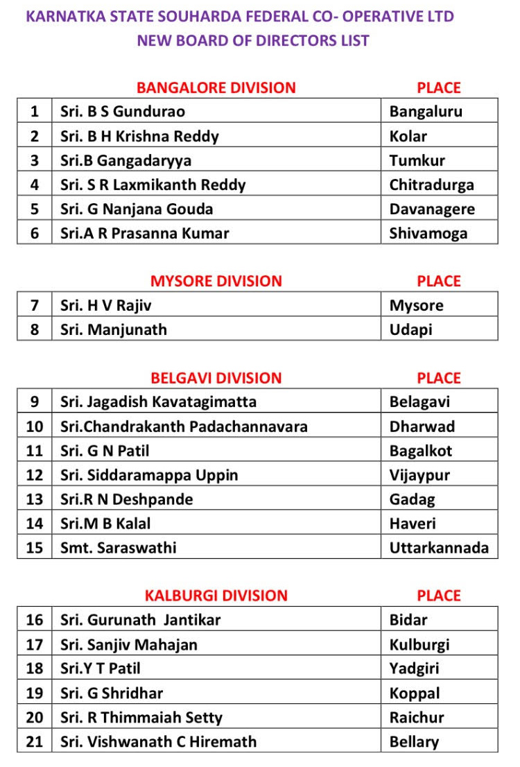 The elections to the Board of Directors of the Karnataka State Souhardha Federal Cooperative Bangalore were held on 28th July, 2017.