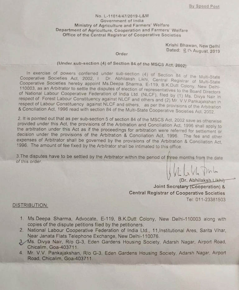 The Central Registrar in his letter writes “In exercise of powers conferred under sub-section (4) of Section B4 of the Multi-State Cooperative Societies Act, 2002. Dr Abhilash Likhi Central Registrar of Multi-State Cooperative Societies hereby appoint Ms Deepa Sharma E-119, BK Dutt Colony New Delhi 110003, as an Arbitrator to settle the disputes of election of representatives to the Board Directors of National Labour Cooperative Federation of India Ltd (NLCF) filed by (1) Ms Divya Nair in respect of Forest Labour Constituency against NLCF and others and (2) M VV Pankajakshan respect of Labour Constituency against NLCF and others as per the provisions of the Arbitration & Conciliation Act, 1996 read with section 84 of the Multi-State Cooperative Societies Act 2002”.