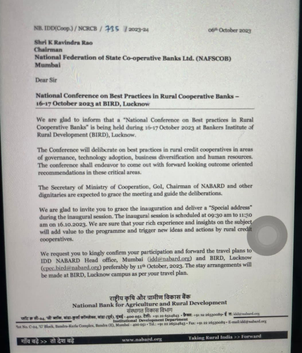 Denying the claims of Nafscob Managing Director of not being invited to the two day National Conference of Nabard at BIRD, Lucknow, the top official of Nabard on condition of anonymity shared the invitation letter sent to the Nafscob Chairman K Ravindra Rao by Nabard on 6th October 2023.