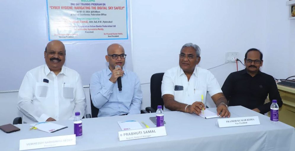 The Telangana State Cooperative Urban Banks Federation recently organized a training program titled “Cyber Hygiene: Navigating the Digital Sky Safely” for CEOs, GMs, AGMs, IT Heads, and IT Officers of Cooperative Urban Banks in Telangana.