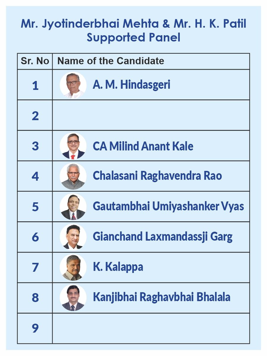 The candidates backed by Mehta-Patil are, A.M.Hindasgeri, CA Milind Kale, Chalasani Raghvendra Rao, Gautambhai Vyas, Gianchand Garg, K Kalappa and Kanjibhai Bhalala.