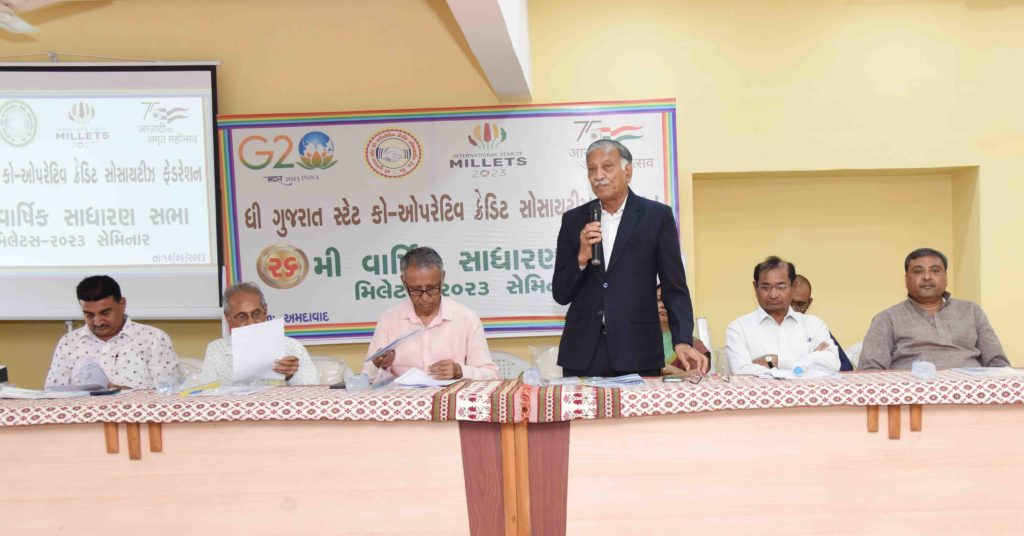 The 26th Annual General Meeting of Gujarat State Co-operative Credit Societies Federation and International National Year of Millets – 2023 were recently held under the chairmanship of Ghanshyambhai Amin, Chairman of the Federation at ” Sahyog ” Ahmedabad. The AGM reverberated with Millets.
