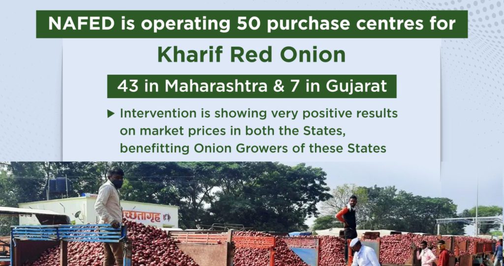 It bears recall that recently the centre had directed National Agricultural Cooperative Marketing Federation of India Limited (NAFED) and National Consumers Cooperative Federation of India Limited (NCCF) to immediately intervene in the market for purchase of Red Onion (Kharif) for simultaneous dispatch and sale to the consumption centres across the country, in the wake of reports of their falling prices.