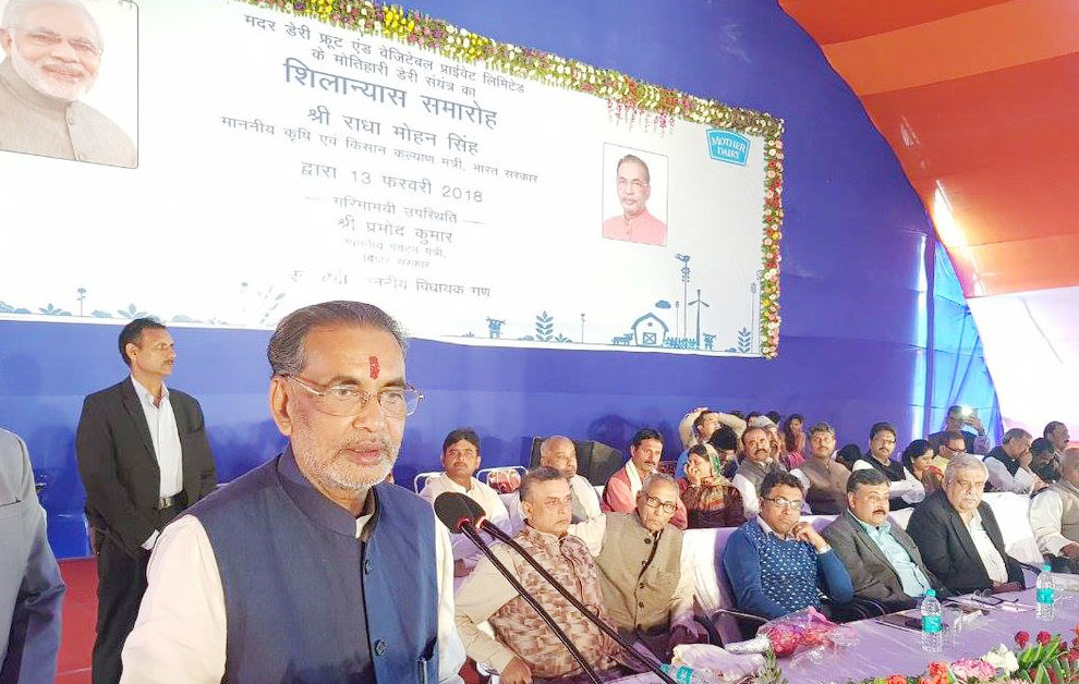 Union Minister for Agriculture and Farmers Welfare Radha Mohan Singh laid the foundation stone for the first dairy plant in Motihari stressing that dairy farming has become a source of livelihood and food security at the rural level, especially for landless and marginal farmers. Motihari is Singh’s constituency.