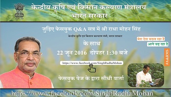 Ministry’s PIB section announces “ Live chat with Radha Mohan Singh on Facebook”. It reads “the Union Minister of Agriculture and Farmers Welfare, Shri Radha Mohan Singh will interact live with citizens and farmers on Wednesday, 22nd June 2016, at 1.30 PM on Minister’s Facebook Page.”