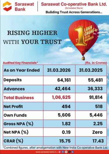 India’s largest urban cooperative bank, Saraswat Co-operative Bank, which recently hogged media headlines for crossing the Rs 1 lakh crore business mark and drew widespread appreciation, including praise from Union Home and Cooperation Minister Amit Shah, has now released its audited figures for FY 2025-26, officially confirming a total business mix of Rs 1.06 lakh crore.