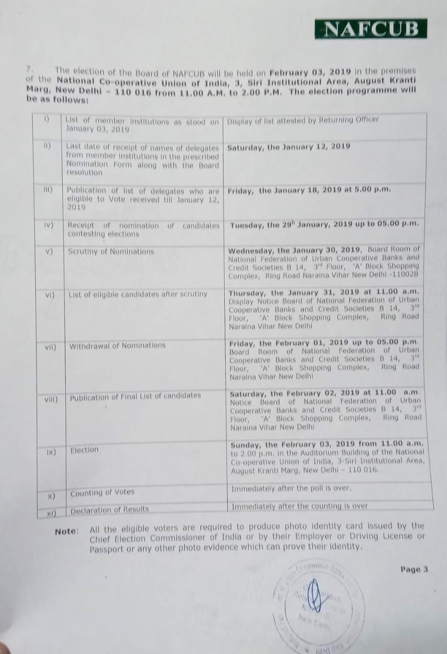 “Whereas Withdrawal of nominations will take place on 1st February 2019 and the final list of candidates left in the fray will be released on 2nd February 2019. Election would be held on 3rd February at National Cooperative Union of India, 3-Siri Institutional Area, August Kranti Marg, New Delhi- 110016”,
