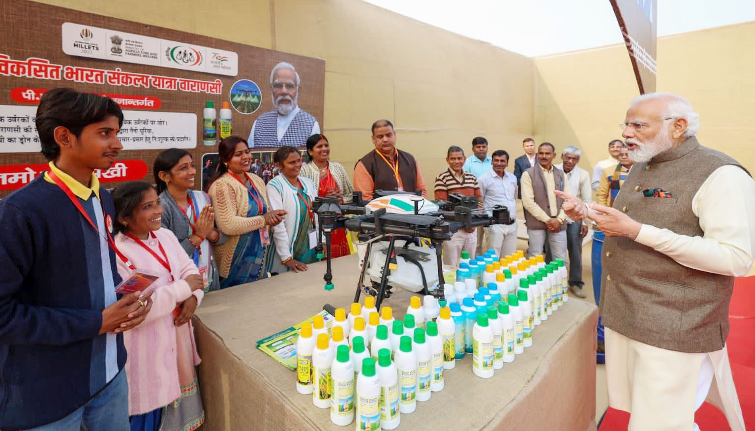 During his trip to Varanasi on Monday where he launched multiple development projects, Prime Minister Shri Narendra Modi also visited IFFCO’s stall in Barki village and interacted with women telling them about the benefits of Nano Urea and Namo Didi drone schemes.