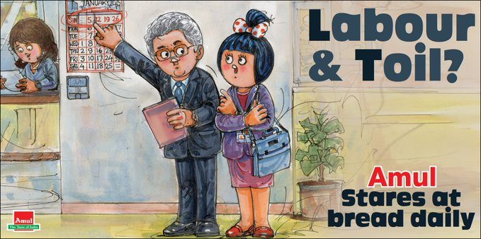 Its latest topical featured a caricature of Subrahmanyan with the cheeky caption, “Labour and Toil?” highlighting “L&T.” The ad also quipped, “Amul stares at bread daily!”—a humorous counter to his remark questioning the value of leisure time.