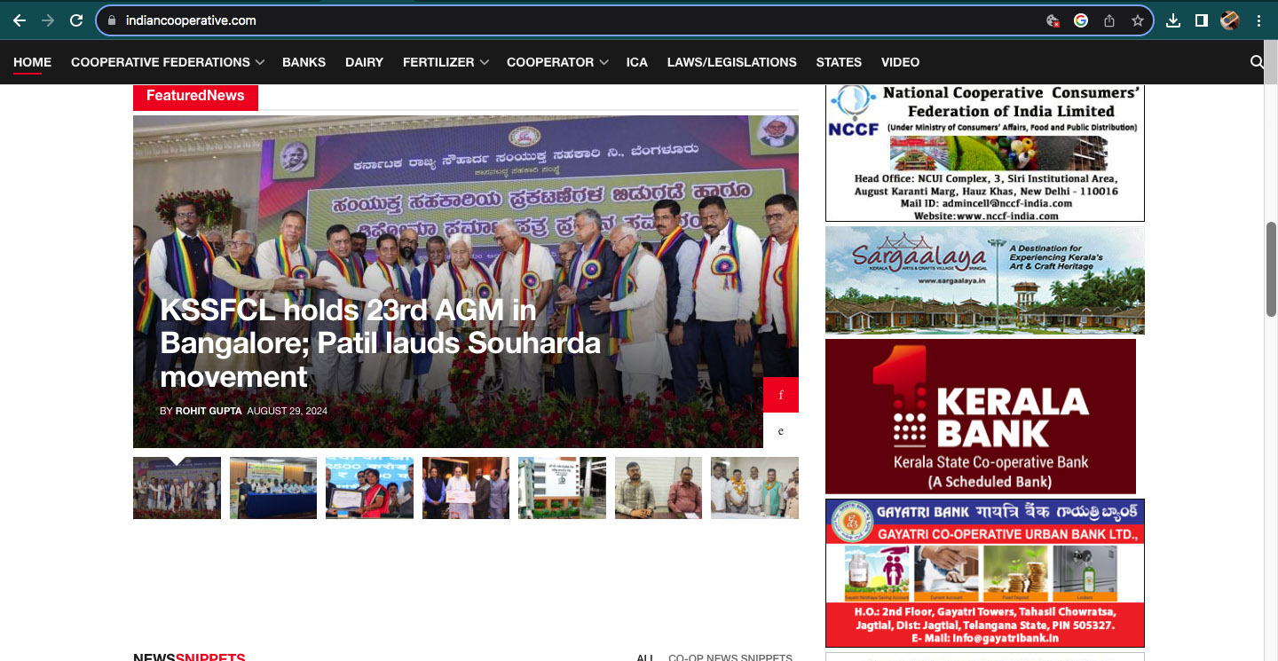 The largest cooperative brand in India, the Kerala State Cooperative Bank, is featured on the homepage of Indian Cooperative, the only news portal dedicated to the cooperative sector. The top cooperative brand chose to feature on Indian Cooperative after recognizing its widespread reach not only in Kerala but also across the country.