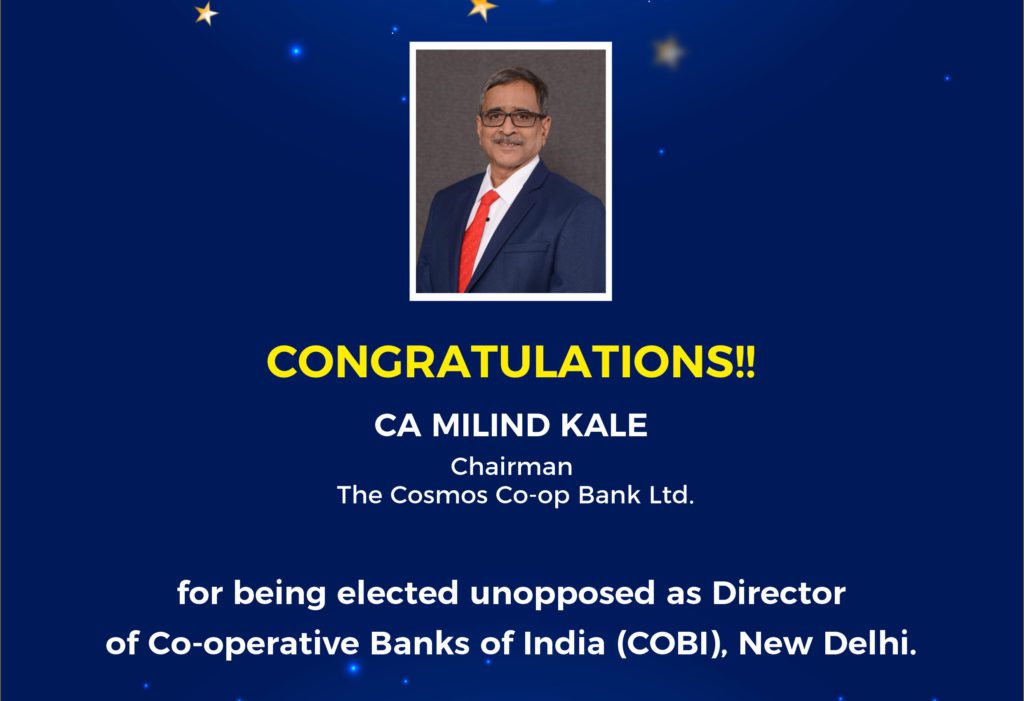 Congratulating Kale, the Cosmos Bank tweeted “ The Cosmos family congratulates Chairman CA Milind Kale on his unanimous election as Director of Co-operative Banks of India (COBI), New Delhi. This is a proud moment for all of us.”