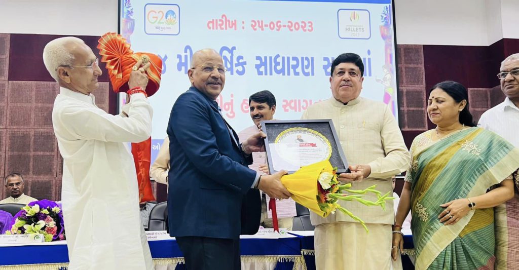 NCUI President Dileepbhai Sanghani, Banas Dairy Chairman Shankar Chaudhary and many veteran cooperators felicitated Patel, who is also the Chairman of Gujarat State Cooperative Bank, with memento and bouquet.