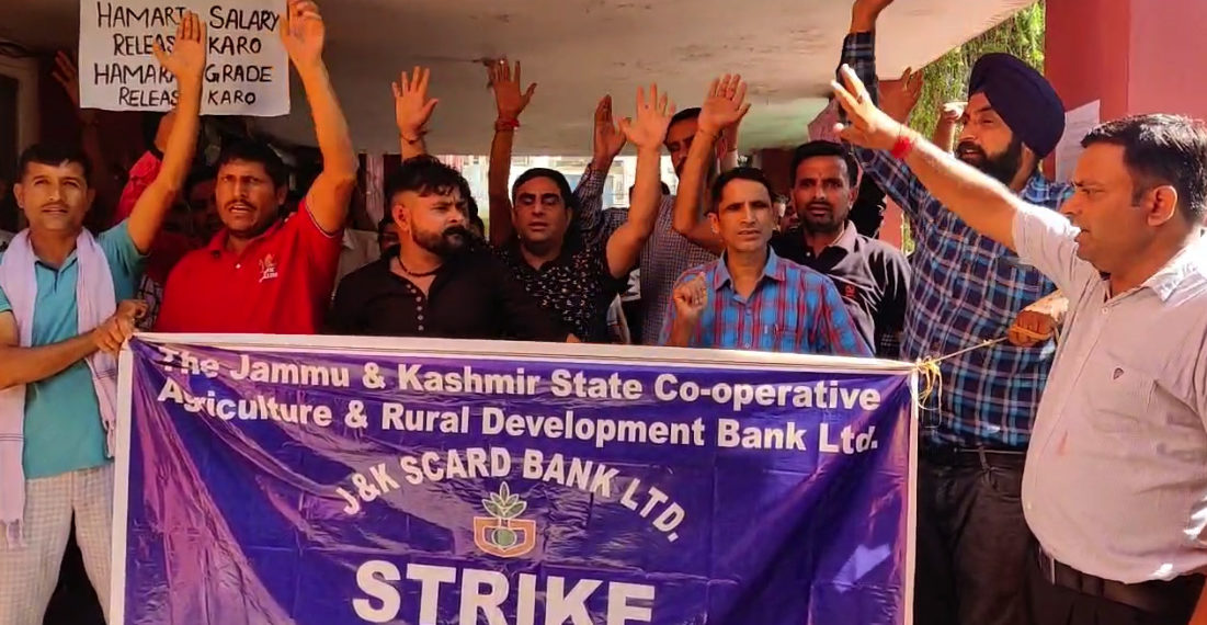 The employees of the Jammu and Kashmir State Cooperative Agriculture and Rural Development Bank Ltd (J&K SCARD Bank) staged a protest recently, demanding the immediate release of their pending salaries.
