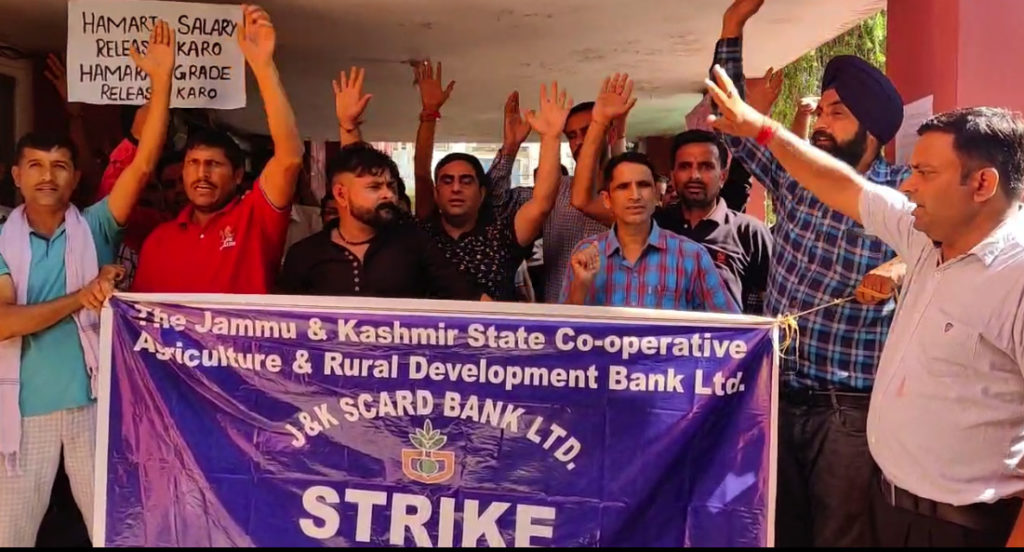 The employees of the Jammu and Kashmir State Cooperative Agriculture and Rural Development Bank Ltd (J&K SCARD Bank) staged a protest recently, demanding the immediate release of their pending salaries.