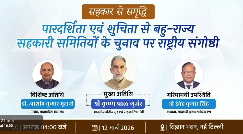 Union Minister of State for Cooperation Krishan Pal Gurjar will address a national seminar on “Elections in Multi-State Cooperative Societies with Transparency & Integrity” today on March 12, 2026, at Vigyan Bhawan. The event is expected to bring together senior policymakers, cooperative leaders, administrators and sector experts to deliberate on strengthening transparency and fairness in the electoral processes of Multi-State Cooperative Societies (MSCS).