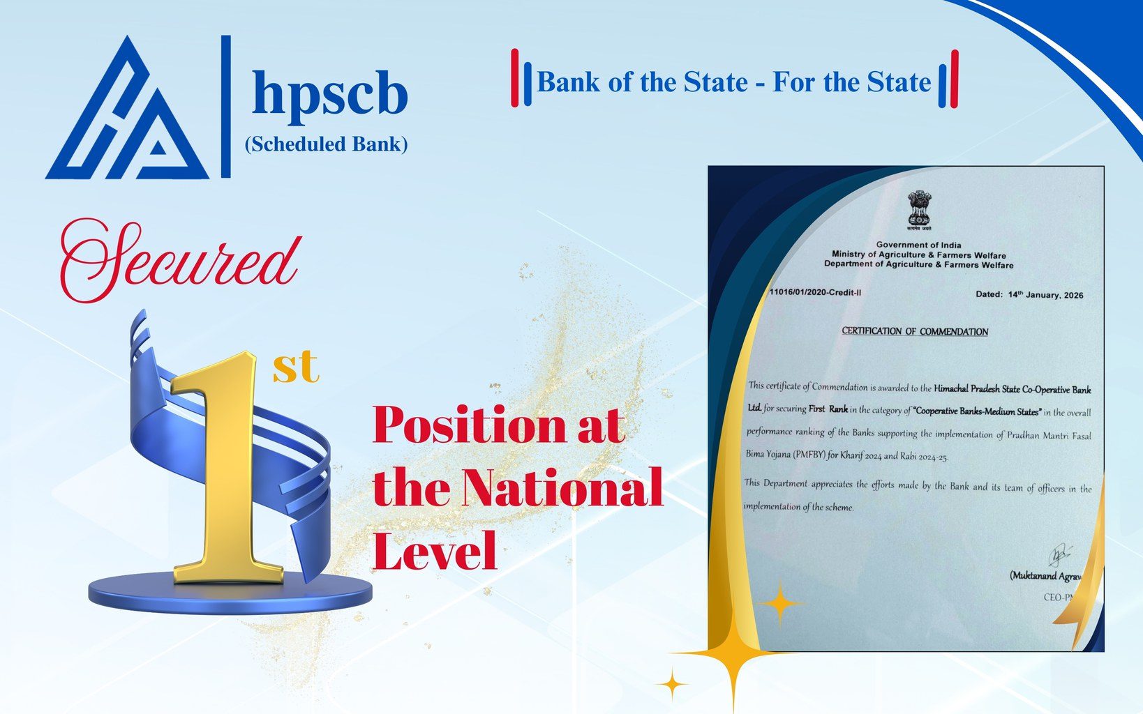 The Himachal Pradesh State Cooperative Bank (HPSCB) has achieved a major national milestone by securing First Position in overall performance for Medium Category States under the Pradhan Mantri Fasal Bima Yojana (PMFBY) for Kharif 2024 and Rabi 2024–25.