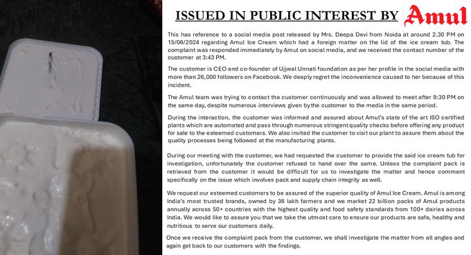 On X, Amul wrote “issued in public interest” wherein it offers to lend all help to the customer in question. Amul wrote “ This has reference to a social media post released by Mrs. Deepa Devi from Noida at around 2.30 PM on 15/06/2024 regarding Amul Ice Cream which had a foreign matter on the lid of the ice cream tub. The complaint was responded immediately by Amul on social media, and we received the contact number of the customer at 3:43 PM.