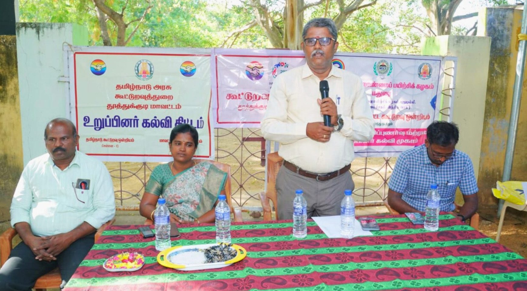 The event was coordinated by Mrs. R. Sakthi Pemila, Sub-Registrar of Tiruchendur Circle. S. Sorna Selvam, Cooperative Union Assistant, delivered the welcome address, while A. Sam Daniel, Cooperative Sub-Registrar/Secretary of Thoothukudi District Cooperative Union, addressed members on loan facilities as well as their rights and responsibilities.
