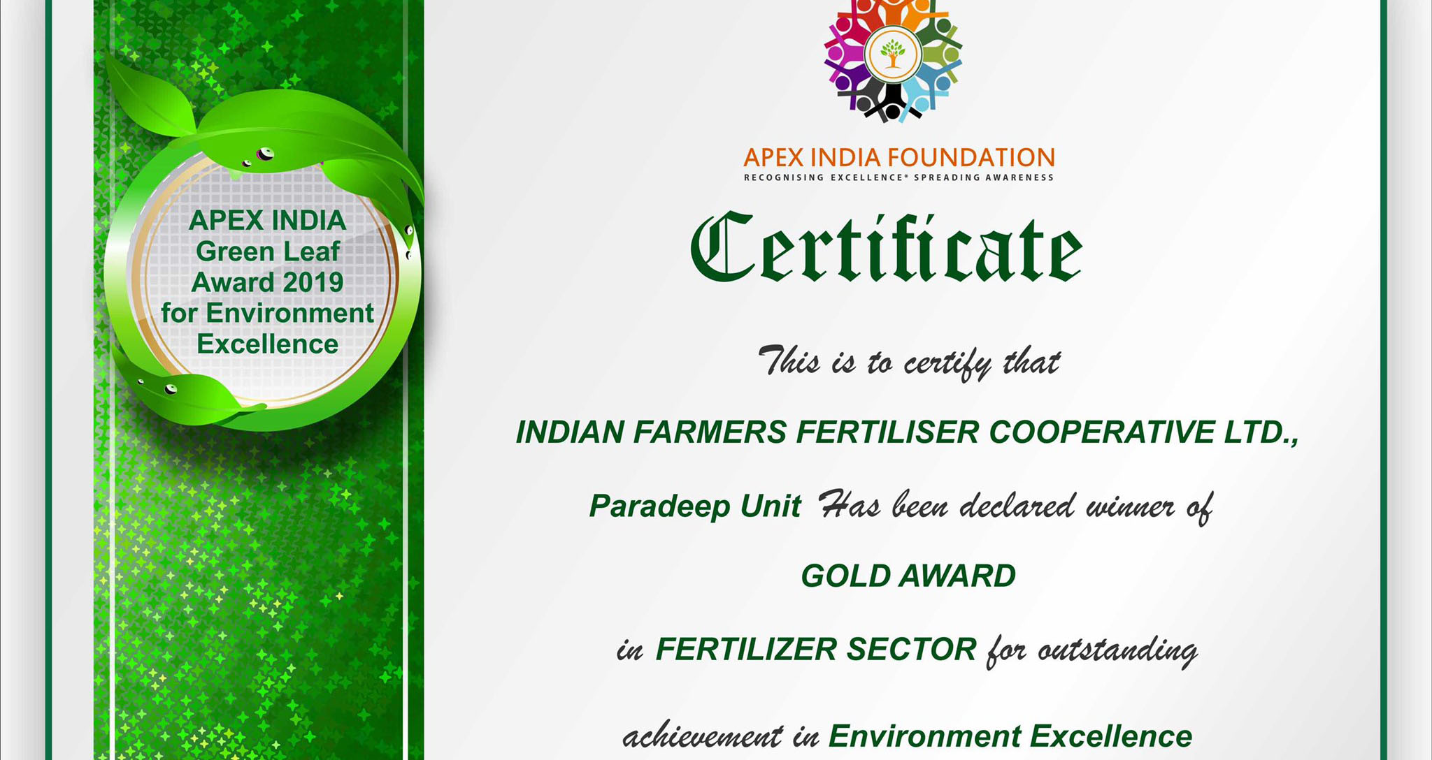 “This is to certify that Indian Farmers Fertilizer Cooperative Limited, Paradeep Unit has been declared winner of Gold Award in fertilizer sector for outstanding achievement in Environment Excellence”, according to the certificate.