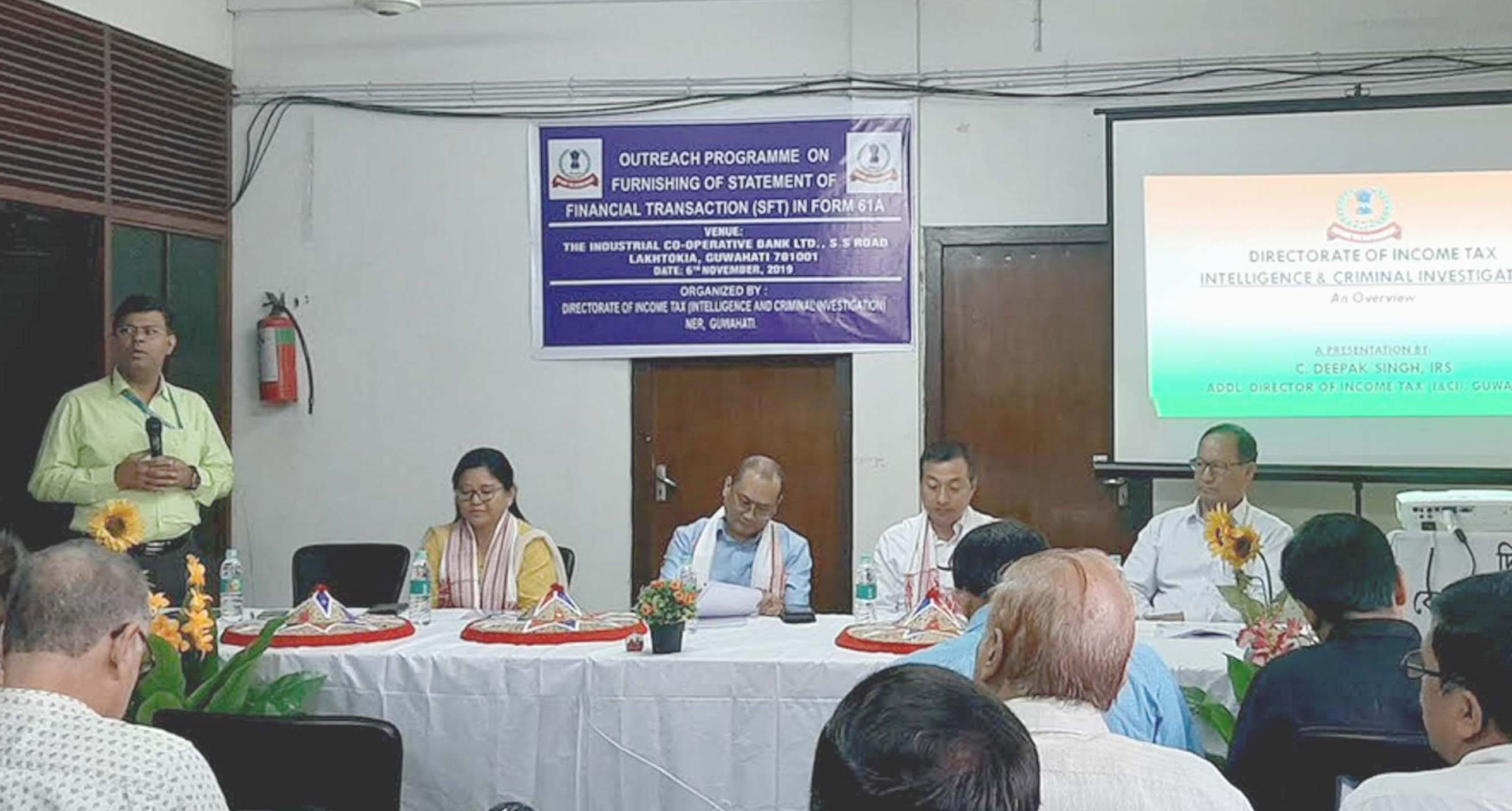 C Deepak Singh, IRS, who the Additional Director (Intelligence &Criminal Investigation), NER, Guwahati, explained to the cooperative bank officials the importance of cooperative banks for collection of the information at source itself. K.T Rainam, IRS, Deputy Director presented the procedures of updation of data through an Audio Visual presentation.