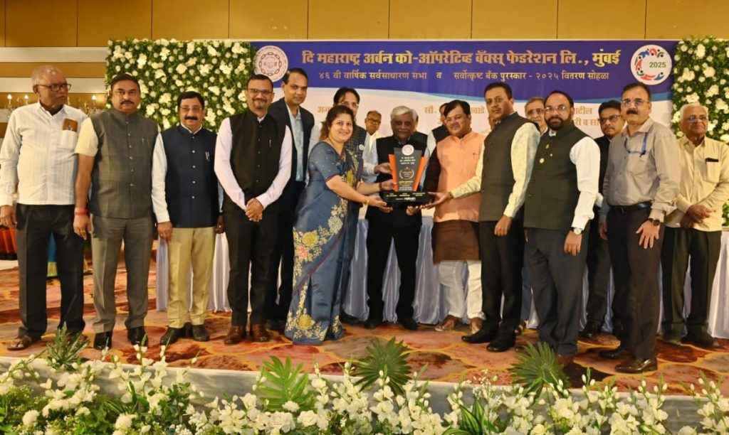 The award was presented by Jyotindra Mehta, Chairman of the National Cooperative Finance and Development, Mumbai, in the presence of MLC Pravin Darekar, Ajay Brahmecha, Federation Chairman, Vice-Chairman Mrs. Vaishali Awade, and other distinguished dignitaries.