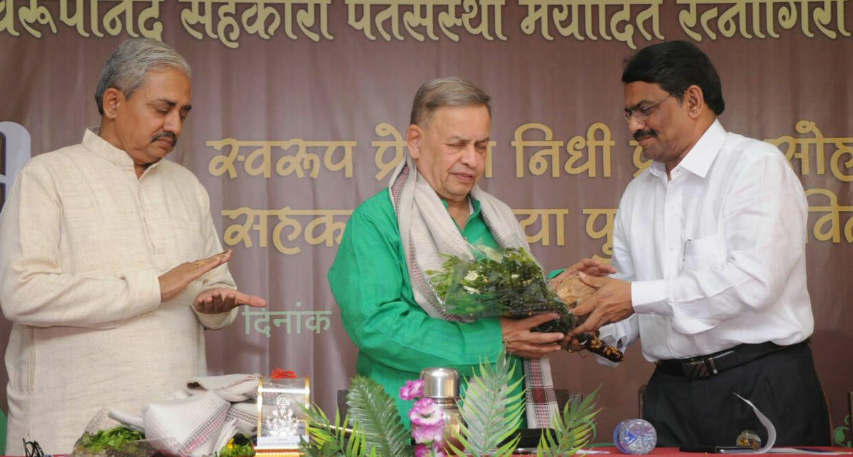 Swami Swarupanand Sahakari Patsanstha Ltd Chairman Adv Deepak Patwardhan felicitated Sahakar Bharti Patron Satish Marathe on the occasion of its 27th Foundation Day program held at Ratnagiri, Maharashtra.