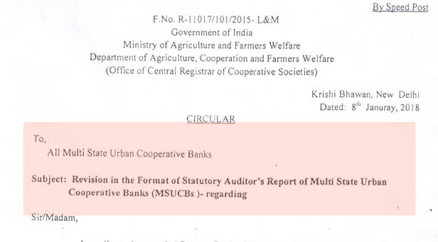 Ministry of Agriculture and Farmers Welfare has recently issued a circular to all Multi-State Urban Cooperative Banks across the country regarding “Revision in the format of Statutory Auditor’s Report of MSUCBs”.