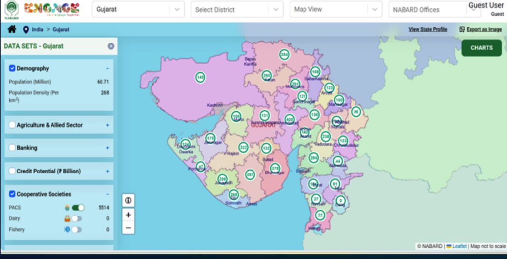 According to NABARD, a nationwide GIS-based thematic map has been developed to visually distinguish Gram Panchayats based on the level of PACS service coverage. The interactive dashboard uses a color-coded mapping system, Green for fully covered GPs, Yellow for partially covered, and Orange for those not covered. Users can zoom into village-level data to instantly access details such as the PACS name, secretary, and contact information.