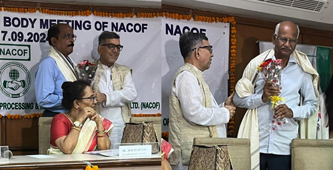 The agri-cooperative NACOF used the occasion of its 15th AGM to felicitate two veterans who made significant contributions to the cooperative movement during their careers. These veterans are N. Satyanarayan, former CE of NCUI, and B.K. Mishra, former MD of Fishcopfed.