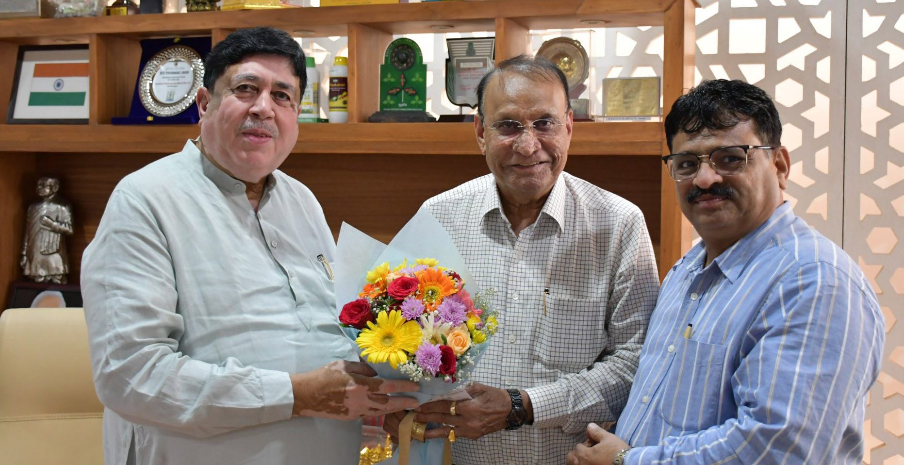 Chairman of National Agricultural Cooperative Marketing Federation of India, Jethabhai Bharwad, paid a courtesy visit to the headquarters of Gujarat State Cooperative Marketing Federation Ltd in Gandhinagar, highlighting continued engagement among key cooperative institutions. GUJCOMASOL Chairman Dileep Sanghani received him with warmth.