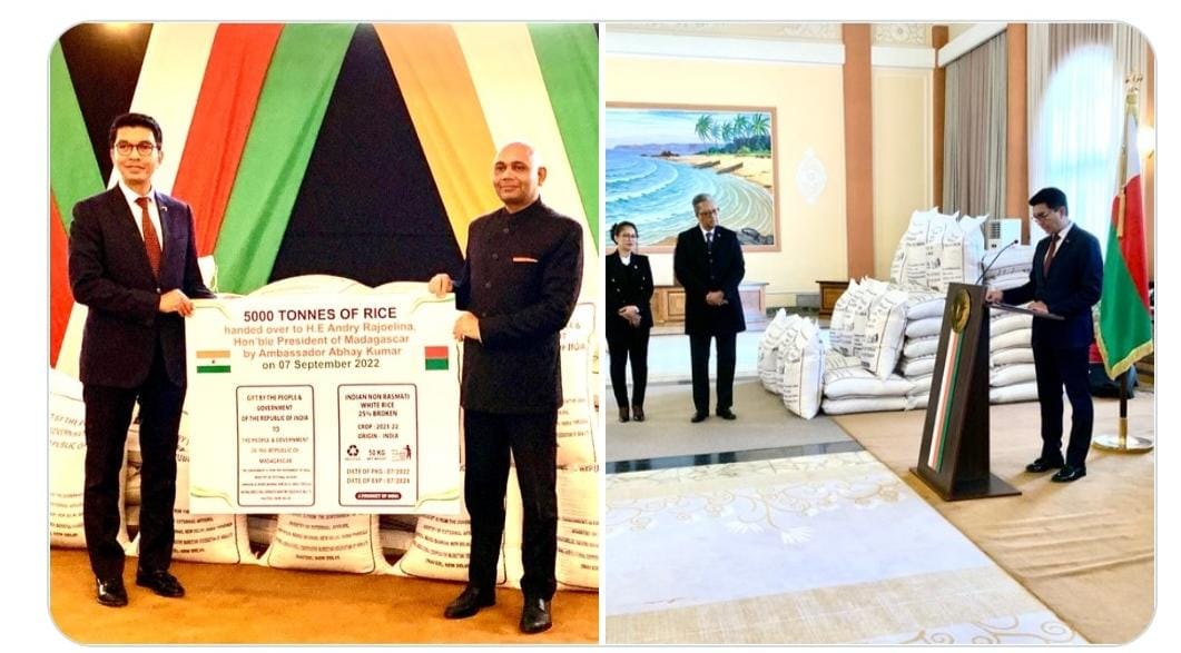 Indian ambassador Abhay Kumar handed over 5000 MT Rice supplied by Govt. of India as a humanitarian assistance through agri cooperative NAFED to Madagascar President Andry Rajoelina at the Lavoloha Palace on Wednesday.