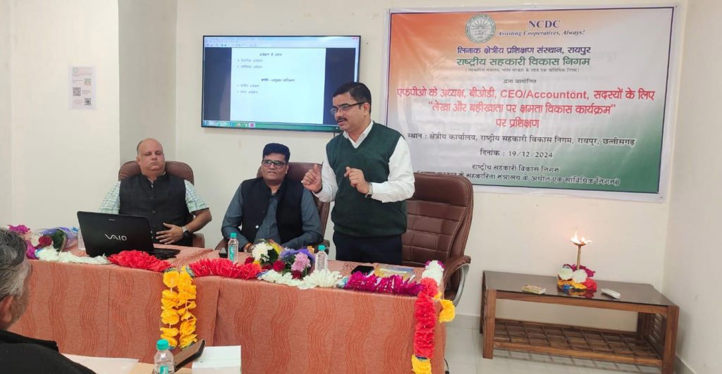The session, focused on capacity development in accounting and bookkeeping, was conducted by the NCDC Regional Office, Raipur. Kailash Kumar Kaushik, Regional Director of NCDC Raipur, presented a brief overview of the FPO scheme to the participants.