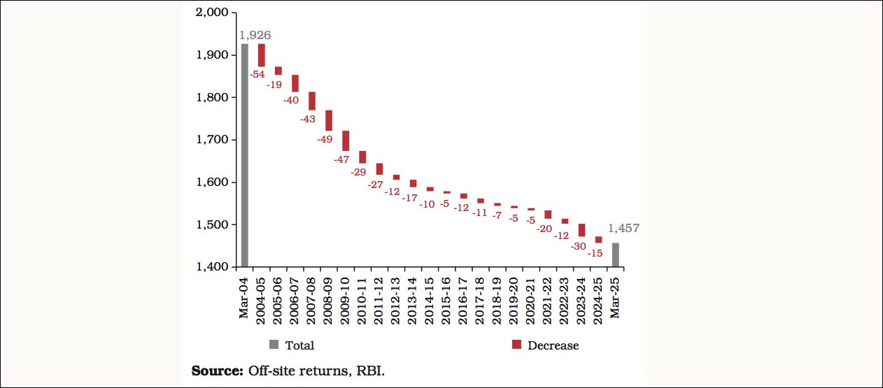 The Reserve Bank of India’s (RBI) long-running consolidation drive in the urban co-operative banking (UCB) sector, initiated in 2004-05, has led to a steady reduction in the number of banks, with the total declining from 1,926 at end-March 2004 to 1,457 at end-March 2025.