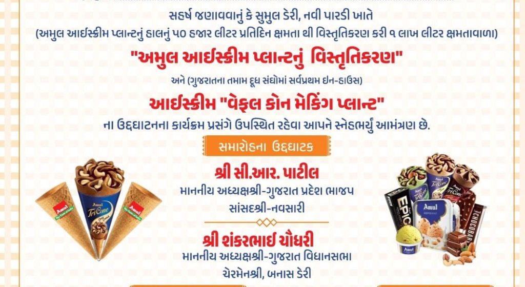 Gujarat BJP President CR Patil will inaugurate the Surat District Co-operative Milk Producers’ Union (Sumul Dairy) Ice-Cream cone making plant at Navi Pardi village in Kamrej Taluka in Surat district today on Thursday, which will produce 3 lakh cones daily.