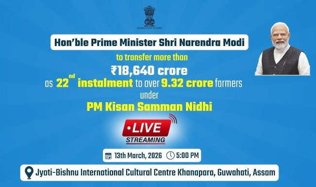 Prime Minister Narendra Modi will release the 22nd installment of the Pradhan Mantri Kisan Samman Nidhi (PM-Kisan) scheme on March 13, transferring Rs 18,640 crore directly into the bank accounts of 9.32 crore farmers across the country. The transfer will take place during a programme in Guwahati, Assam.