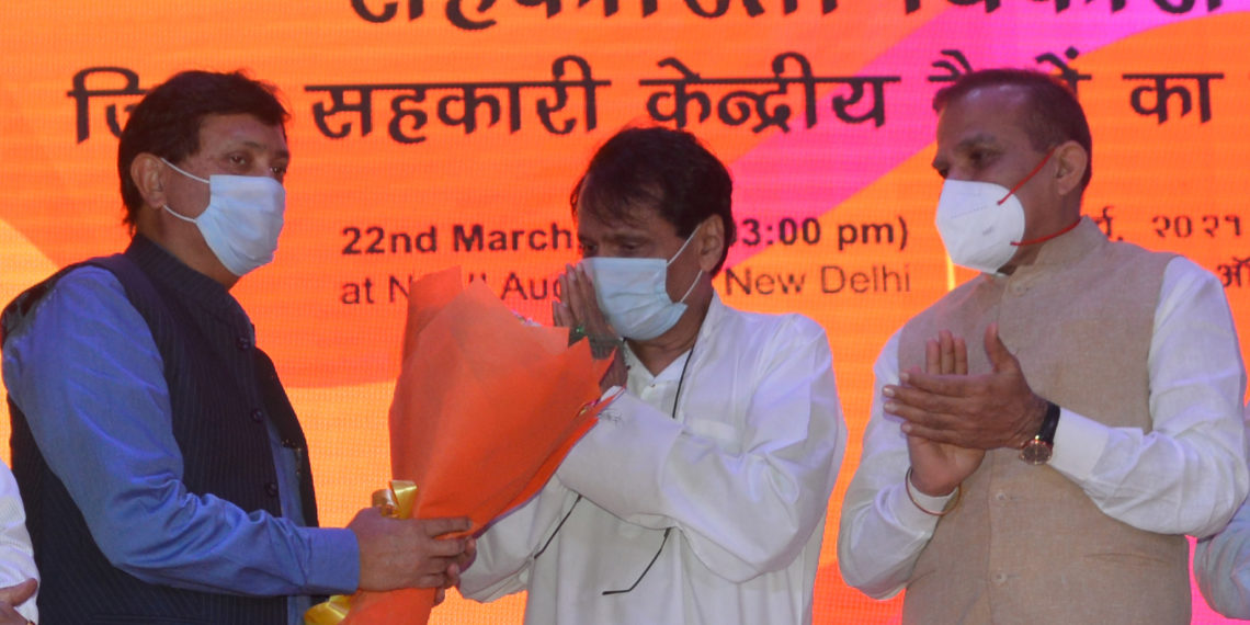 The newly appointed Chief Executive of the apex body NCUI Sudhir Mahajan was felicitated on the occasion of the launch of Cooperative Development Forum. Former Union Minister Suresh Prabhu welcomed the CE with a bouquet of flowers.
