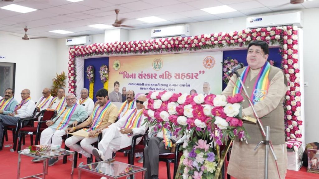 Several cooperative leaders and dignitaries attended the programme, including regional and national office-bearers of Sahakar Bharati, along with representatives of cooperative institutions from Amreli district.