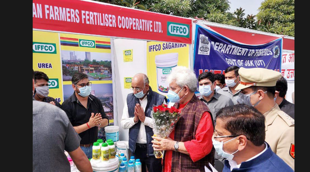 Jammu and Kashmir Lieutenant Governor Manoj Sinha visited the IFFCO stall set up at the five day Kisan Mela 2021 at SKUAST, Jammu.