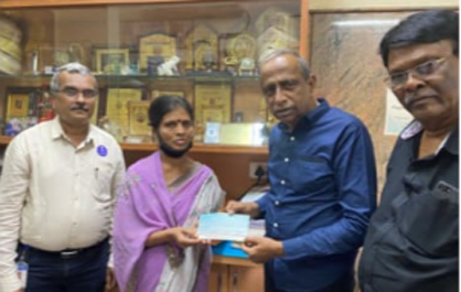 The cheque was handed over to Getha (his mother) by the Society President Jayakumar last week. It bears recall that the bank has recently tied up with ICICI Lombard.
