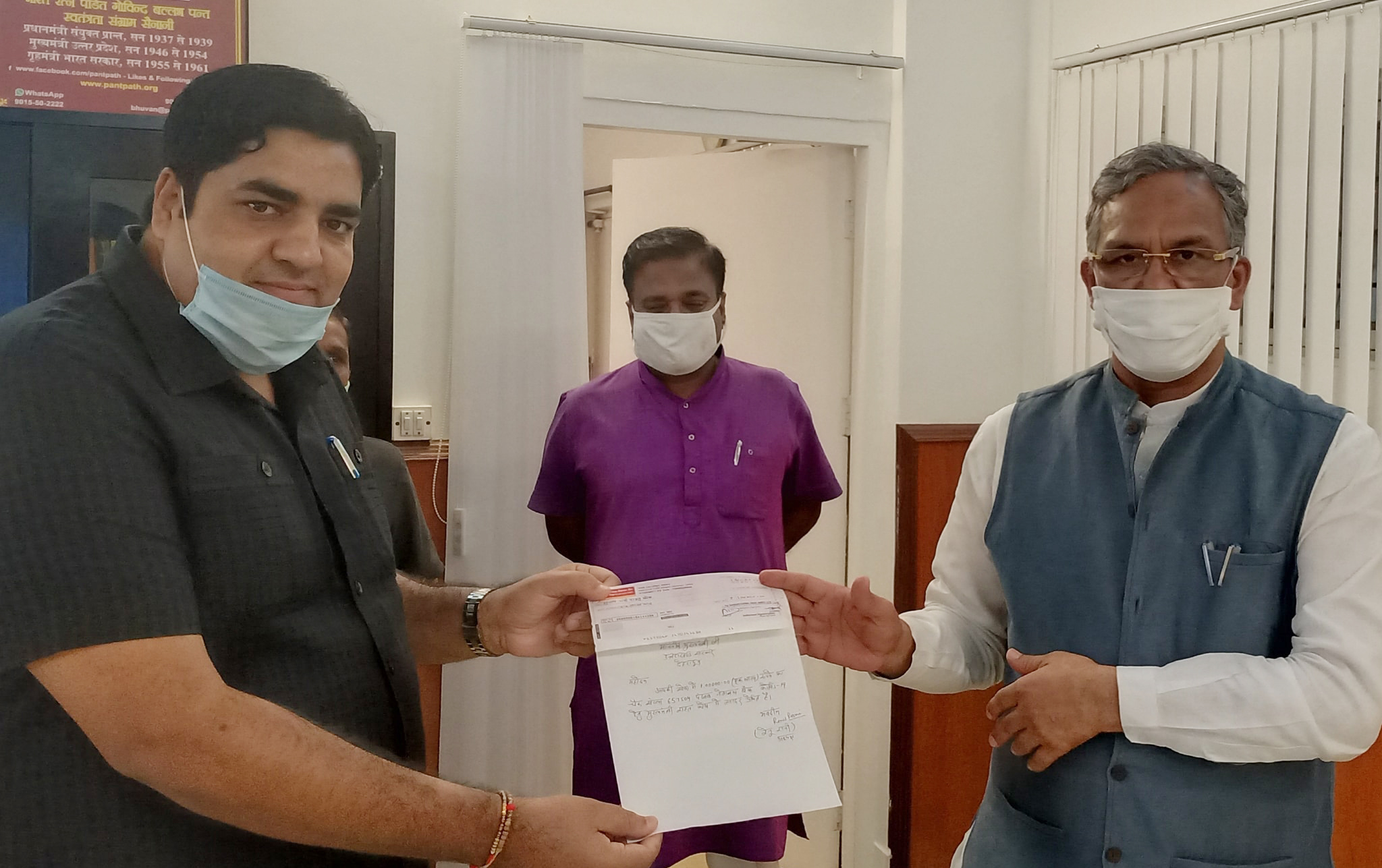 Sharing the news with Indian Cooperative through WhatsApp Rathi wrote, ” Today, given a cheque of one lakh rupees to Chief Minister Trivendra Singh Rawat ji towards the Chief Minister’s Relief Fund due to the Corona epidemic on behalf of the Liberhedi Cooperative Sugarcane Development Committee in the Chief Minister’s Office Dehradun!”.