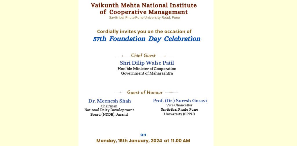 Vamnicom is celebrating its 57th Foundation Day on Monday, 15th January, 2024 at Shivneri Auditorium of the Institute in which Dilip Walse Patil, Maharashtra Minister of Cooperation, will be the Chief Guest. Dr. Meenesh Shah, Chairman NDDB and Prof. (Dr.) Suresh Gosavi, Vice Chancellor, Savitribai Phule Pune University (SPPU) have been invited as the Guests of honour of the Foundation Day function.