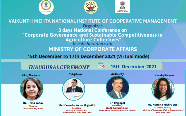 Pune-based prestigious cooperative institution- Vamnicom is organizing a three-day National Conference on “Corporate Governance and Sustainable competitiveness in Agricultural Collectives (Cooperatives and farmer Producers’ Organizations)” from 15 to 17 December 2021 virtually.