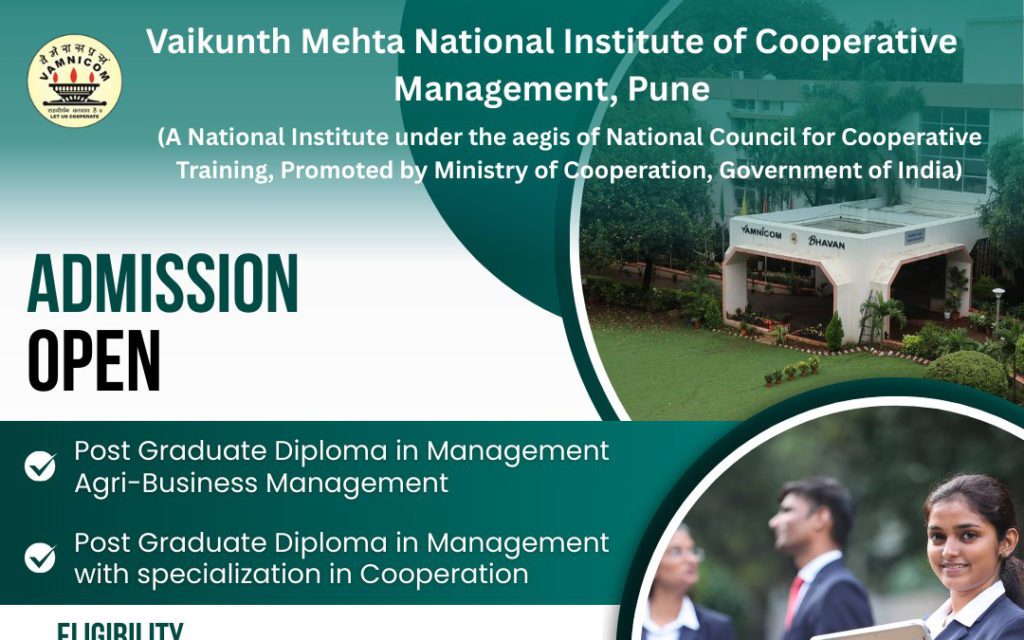 The Vaikunth Mehta National Institute of Cooperative Management (VAMNICOM), Pune, has announced the opening of admissions for its Post Graduate Diploma in Management (PGDM) programmes for the upcoming academic session. VAMNICOM is a national institute under the aegis of the National Council for Cooperative Training (NCCT) and is promoted by the Ministry of Cooperation, Government of India.