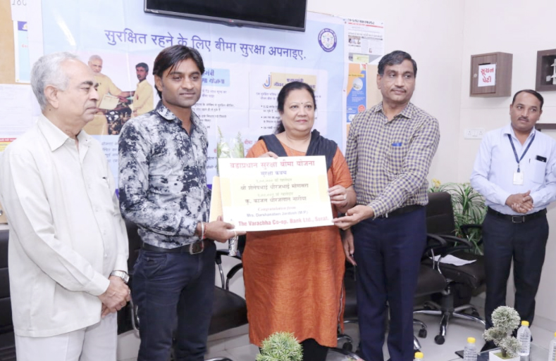 The Varachha Co-operative Bank Ltd., Surat organised a function at their Hira Baug Branch to mark the achievement of enrolling more than one lakh customers under the Pradhan Mantri Suraksha Bima Yojana in the presence of Shri P.B.Dhakecha Saheb, Founder Chairman of the Bank and Shri Kanjibhai R. Bhalala, current Chairman.