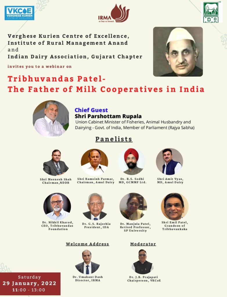Rupala said this while participating virtually in a Webinar on Tribhuvandas Patel – The Father of Milk Cooperatives in India. The Webinar was organized by Verghese Kurien Centre of Excellence IRMA (VKCOE-IRMA) and Gujarat Chapter of Indian Dairy Association.