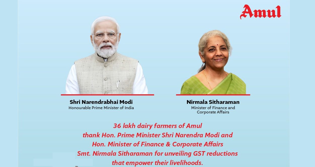 In a media interaction Jayen Mehta, Managing Director of Amul’s parent body (GCMMF) is quoted saying “On behalf of 36 lakh farmer families affiliated with Amul and over 10 crore families in the broader dairy ecosystem, the society was “thankful to PM Modi and FM Sitharaman for this landmark decision,” noting that more than 30 dairy and food categories benefited from the new GST cuts.