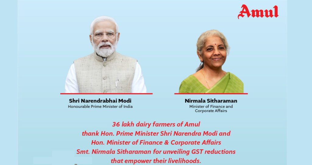 In a media interaction Jayen Mehta, Managing Director of Amul’s parent body (GCMMF) is quoted saying “On behalf of 36 lakh farmer families affiliated with Amul and over 10 crore families in the broader dairy ecosystem, the society was “thankful to PM Modi and FM Sitharaman for this landmark decision,” noting that more than 30 dairy and food categories benefited from the new GST cuts.