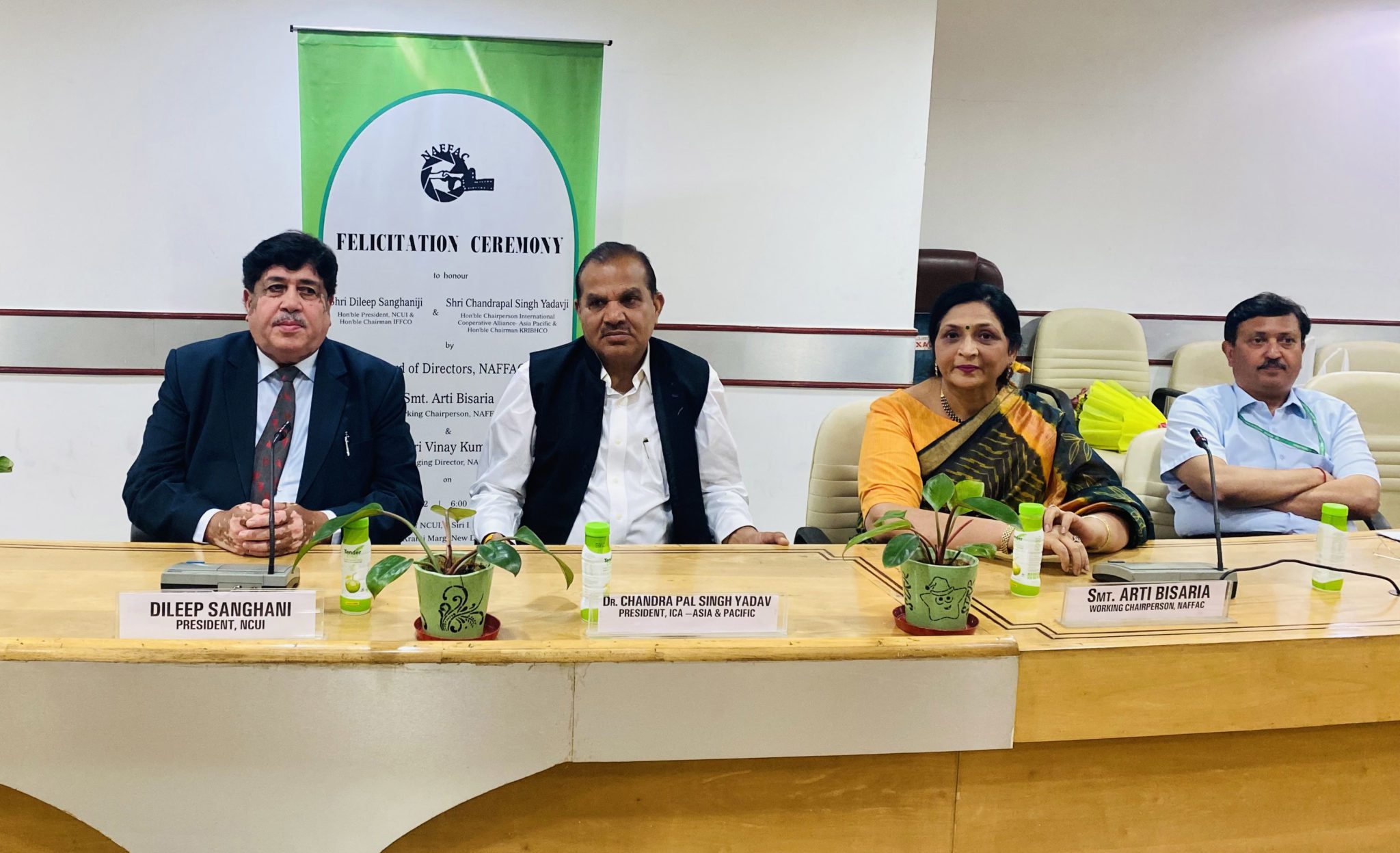 NAFFAC, led by its Working Chairperson Arti Biseria organized a felicitation ceremony for two cooperative stalwarts Dr. Chandra Pal Singh and Dileep Sanghani for their respective achievements at the NCUI headquarters on Wednesday. While Chandra Pal got elected as the president of ICA AP, Sanghani rose from the ranks to chair both NCUI and IFFCO.