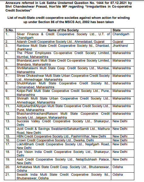 Replying to another question, Shah informed that more than 44 multi-state co-operative societies have been wound up by the Ministry in recent times. Among others, Adarsh Credit Co-op also figures in the list.