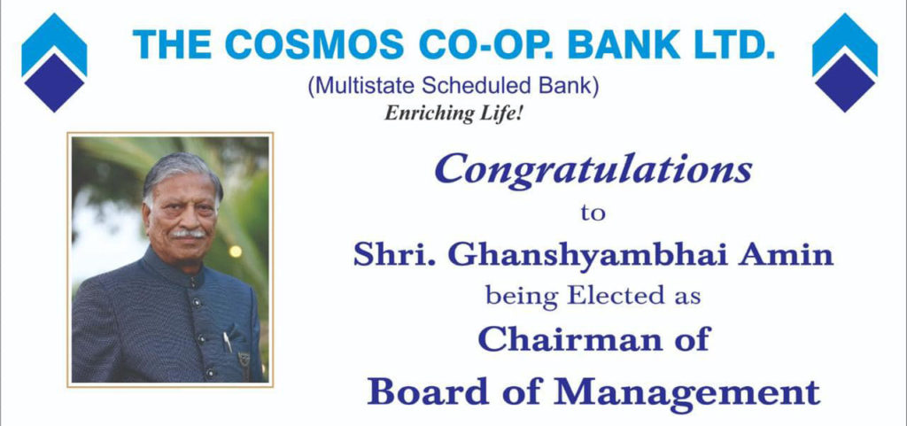 Following the announcement of Amin’s appointment, social media platforms were abuzz with congratulatory messages from well-wishers. Cosmos Bank’s business is also well spread in Gujarat- a state where Amin is a prominent co-operator.